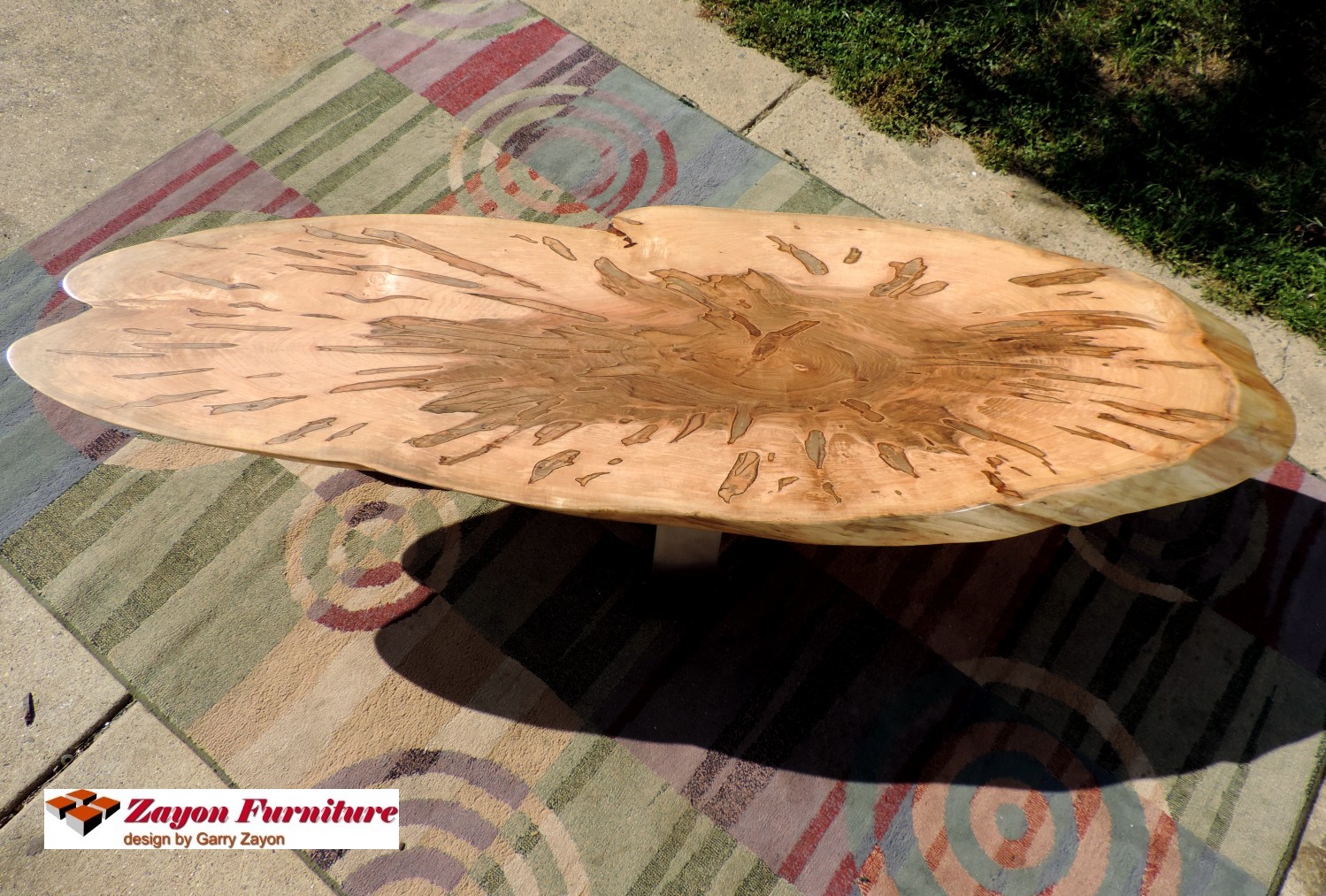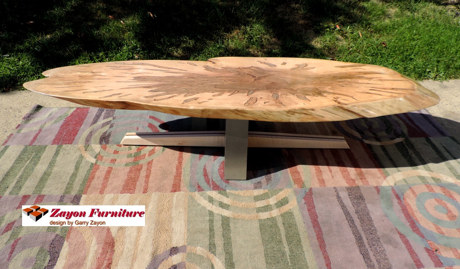 Coffee table is finished Maple slab steel base with quilted maple & walnut inlay by Garry Zayon.